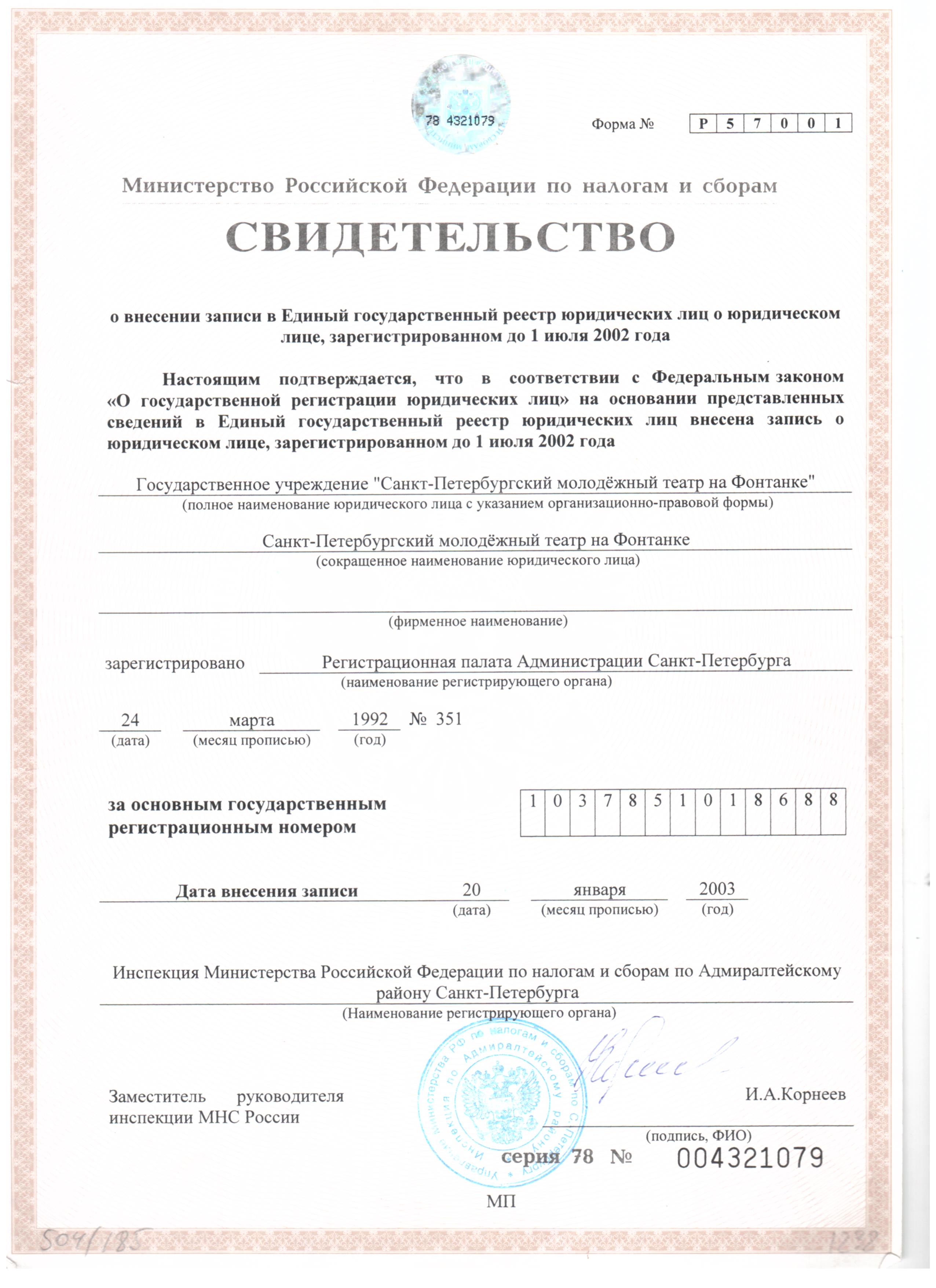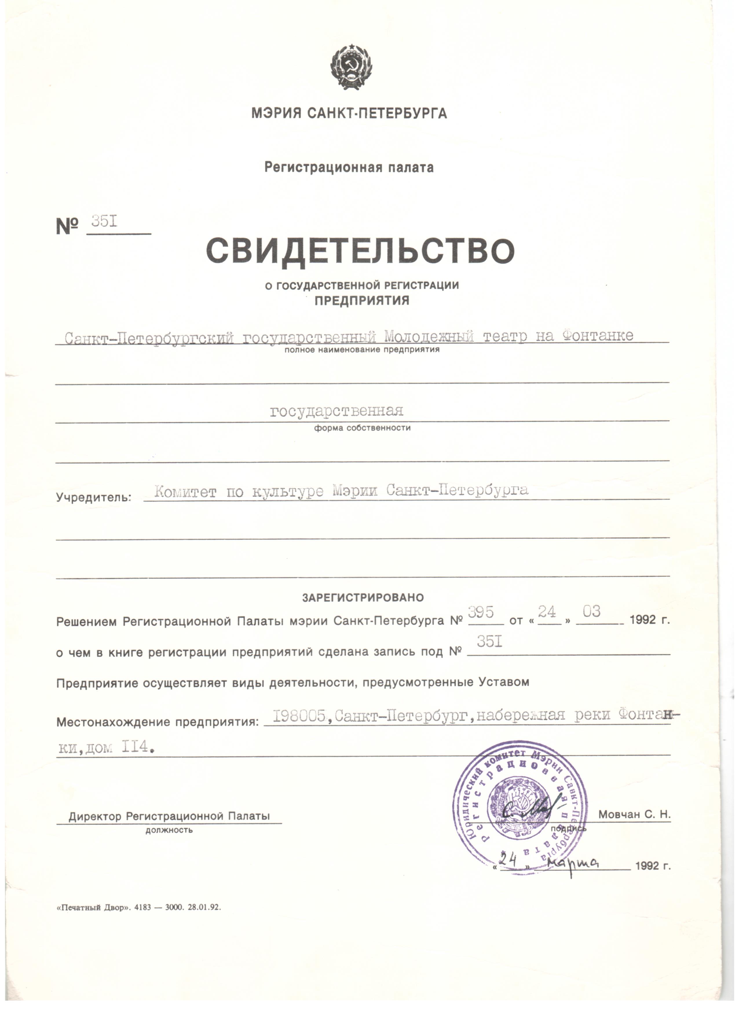 Полное наименование Учреждения: Санкт-Петербургское Государственное Бюджетное Учреждение Культуры «Санкт-Петербургский Молодежный театр на Фонтанке»