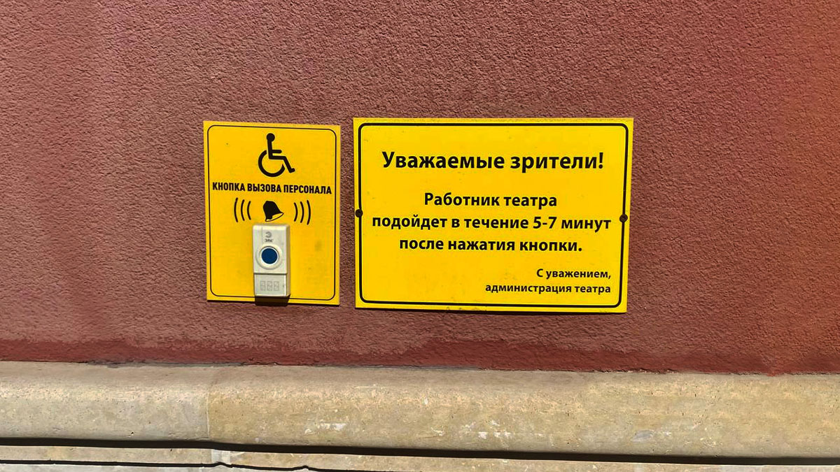Необходимая дополнительная помощь оказывается силами сотрудников театра. Для вызова сотрудников воспользуйтесь телефоном.